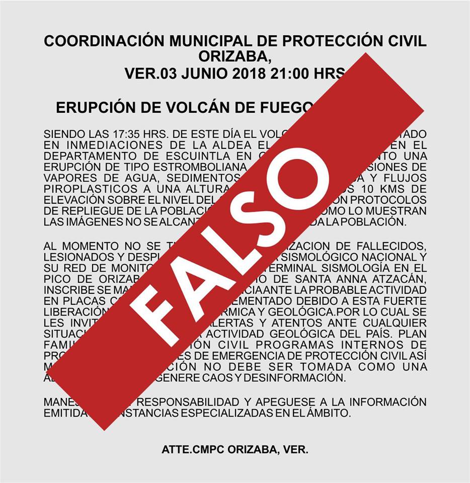 La Coordinación de Protección Civil de Orizaba, Veracruz, no ha emitido ningún comunicado de "alerta" a la población ante la "probable actividad de placas continentales" tras la erupción del volcán de Fuego en Guatemala.